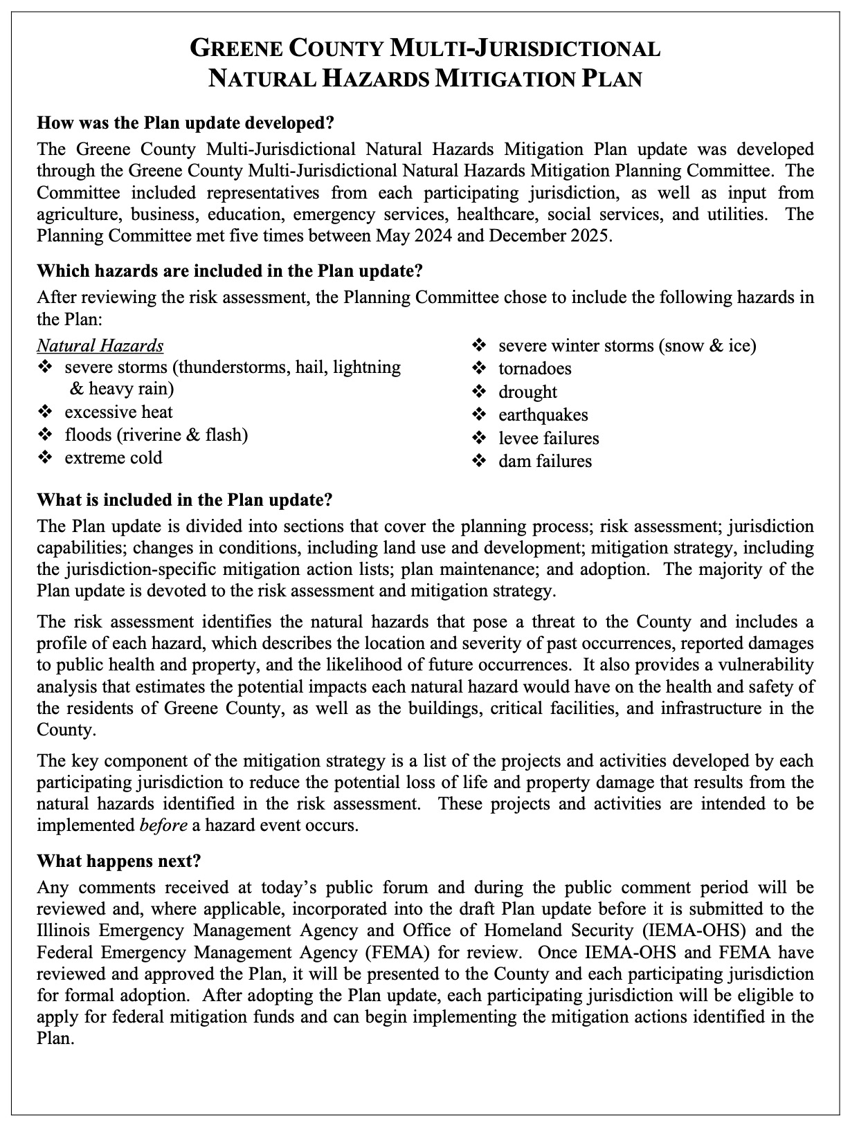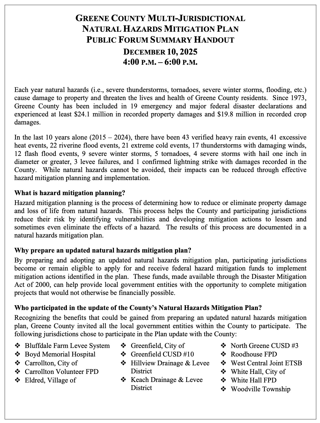 Click here for PDF:Â Greene Co NHMP Update – Summary Sheet Public Forum 12102025